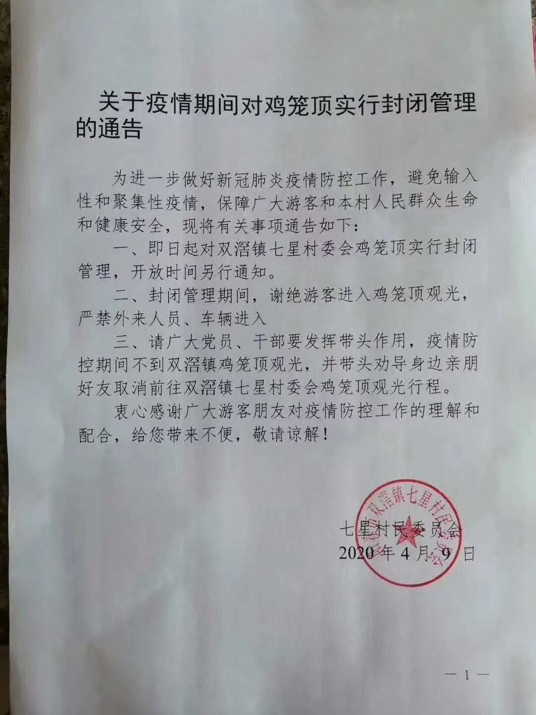 4月中至5月初是陽(yáng)春市雙滘鎮(zhèn)雞籠頂觀光的最佳時(shí)間,今年可能是不能去了,因?yàn)殡p滘鎮(zhèn)七星村委已發(fā)出通告,4月9日起對(duì)雞籠頂實(shí)行封閉管理,開放時(shí)間另行通知,封閉期間謝絕游客進(jìn)入景區(qū),請(qǐng)大家不要再前往雞籠頂了。