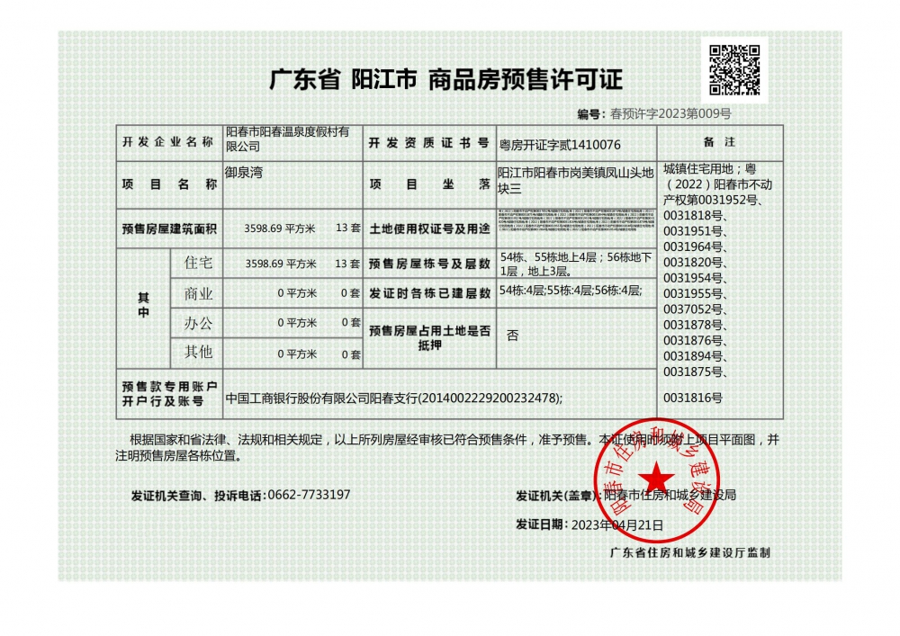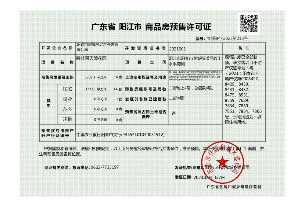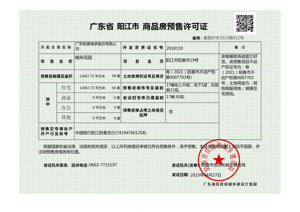 - 陽春市2023年4月份新發(fā)7張預(yù)售證,5.1購房注意看預(yù)售證哦!